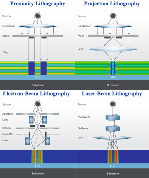 • Experimental layout optimisation and process development are time-consuming and cost-intensive. Lithography simulation gives access to numerous virtual experimental results in a fraction of the time, thereby reducing development and production costs. LAB facilitates the simulation of proximity, projection, laser and electron-beam lithography, benefiting applications such as IC manufacturing, flat panel display, LED, MEMS, 3D packaging, mask manufacturing and nano-fabrication. The fast and accurate calculation of the intensity image allows layout optimisation via Rule-OPC and Model-OPC, mask layout verification, optimisation of process conditions (e.g. illumination source or sample stack) and process window (e.g. defocus and exposure dose variation) by varying the layout or exposure parameters. Once a perfect image contrast has been obtained, 3D resist development modelling allows further optimisation of the resist profile. Complex process effects such as lateral development and density-dependent bias in electron-beam or laser lithography can be analysed and compensated.