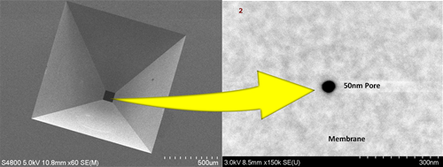 ナノポアとは数十ナノメートルサイズの穴を薄い膜構造に貫通させて、その穴にたんぱく質やウィルスを通過させた時に、