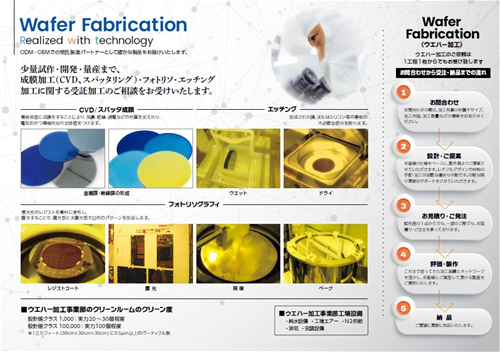 パターニング加工サービス、ウエハーに成膜のみ行ったケースや、ウエハー単体での販売も行っています。