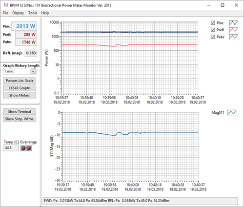 BPM Monitor is a program for monitoring and controlling BPM devices. It displays graphs of the incident, reflected and absorbed powers as functions of time. The reflection coefficient magnitude is also displayed in a separate graph. The history of the graphs can be extended to up to 24 hours. All data on graphs can be easily exported to Excel for analysis.