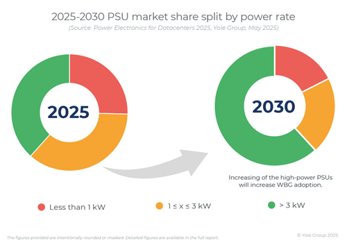 The PSU is one of the essential parts of the hardware in data center powertrain. There are three mainstream PSU standards having different specifications: ATX (Advanced Technology eXtended), CRPS (Common Redundant Power Supply) and Open Compute project (OCP). CRPS dominates across most segments due to flexibility and modularity. OCP is hyperscaler-centric, driven by scale and cost efficiency. Custom PSUs thrive in HPC, where standardization doesn’t meet extreme demands. ATX remains in legacy/low-power setup, but growth is declining. As of 2025, the total PSU market for data centers is estimated to worth more than $7B. Seeing the increasing demand for higher power required by PSU, the market value of PSU higher than 3 kW is expected to dominate the market (~80%) by 2030. Therefore, to meet efficiency and density requirements, wide Bandgap (WBG) semiconductors (i.e., GaN and SiC), are increasingly adopted. The CAGR24-30 market value of SiC and GaN devices will feature a double-digit growth.