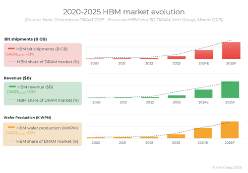 The High-Bandwidth Memory (HBM) market is experiencing exponential growth, primarily driven by the proliferation of AI workloads and HPC applications. The generative AI boom, catalyzed by the introduction of ChatGPT in late 2022, resulted in an unprecedented 187% YoY increase in HBM bit shipments in 2023, followed by an additional 193% surge in 2024. This trajectory is expected to persist. HBM is significantly outpacing the broader DRAM market. Global HBM revenue is projected to increase from $17B in 2024 to $98B by 2030, reflecting a 33% CAGR. Consequently, HBM’s revenue share within the DRAM market is expected to expand from 18% in 2024 to 50% by 2030. The market will see another major inflection point in 2025. Current supply constraints underscore the strategic importance of HBM in AI data centers and advanced computing platforms, as evidenced by reports from SK Hynix and Micron indicating that their HBM production capacity is fully allocated through 2025. These supply-side limitations reinforce the need for investments in capacity expansion to meet the escalating demand.